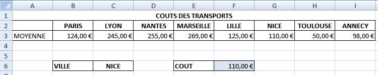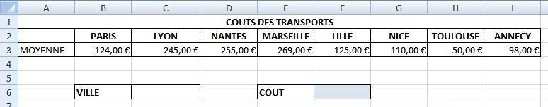 En saisissant la cellule C6 avec par exemple "Nantes" le montant 225€ s'affichera en F6