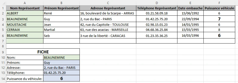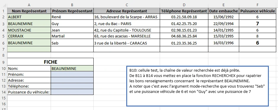De B11 à B14 vous mettez en place la fonction RECHERCHEX pour rapatrier les bons renseignements concernant le représentant BEAUNEMINE.