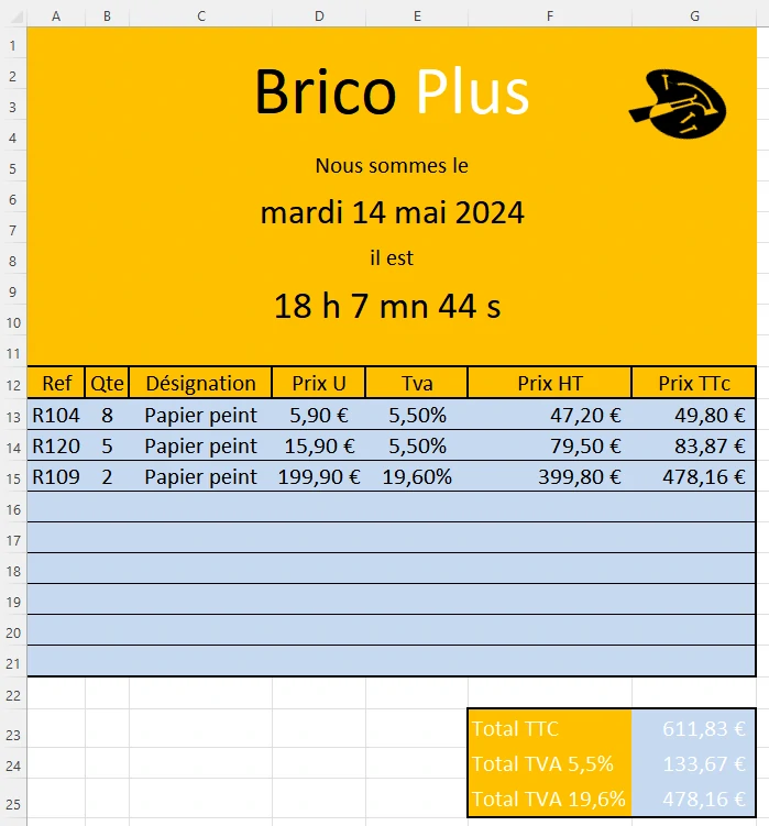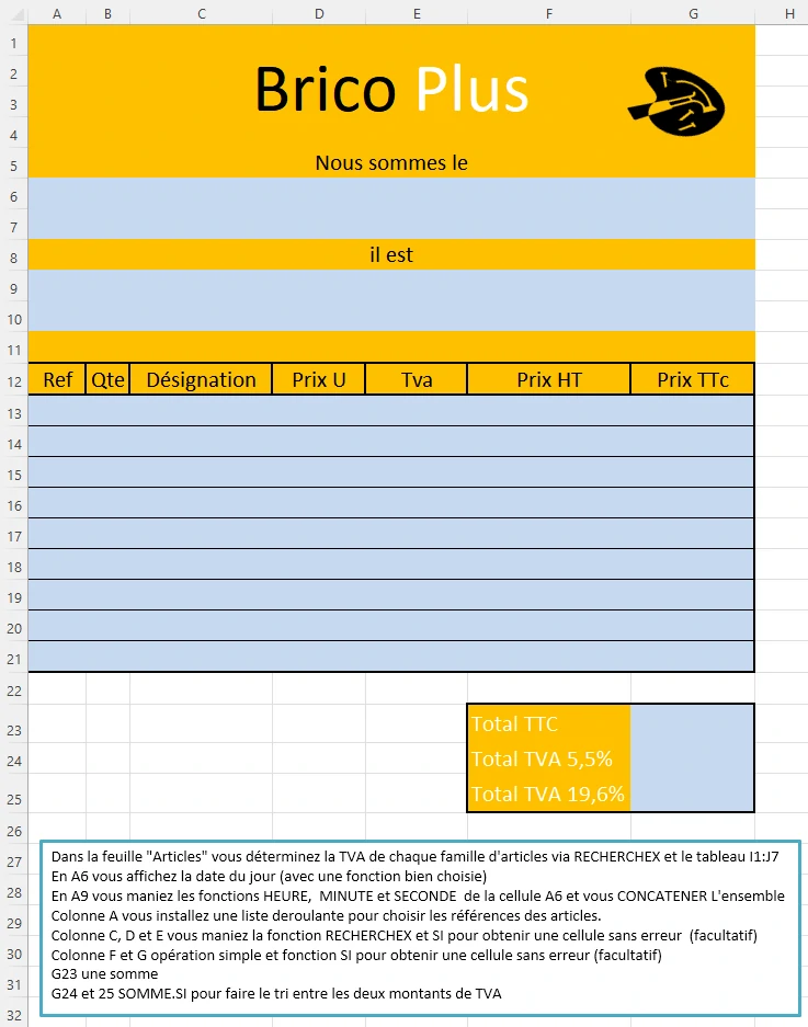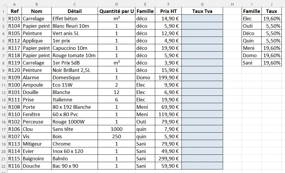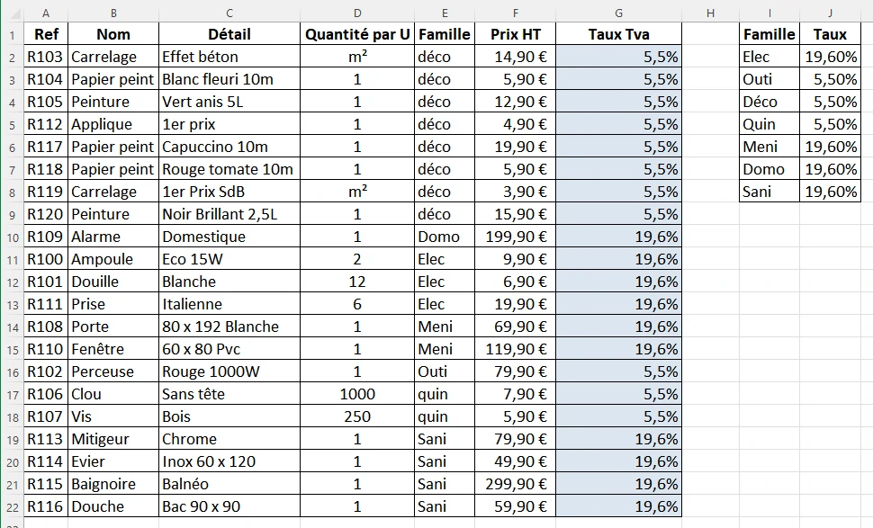Dans la feuille "Articles" vous déterminez la TVA de chaque famille d'articles via RECHERCHEX et le tableau I1:J7