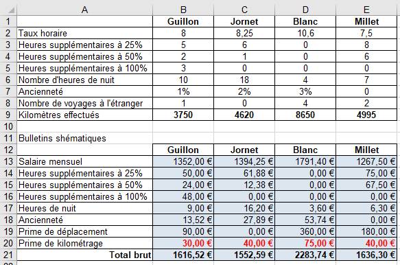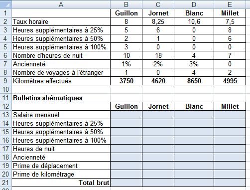 Reproduisez les 2 tableaux ci-dessus. Dans le premier tableau seront saisies les informations relatives aux chauffeurs, et le second représentant, schématiquement, un bulletin de salaire, et relié au précédent par des formules de calcul.