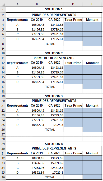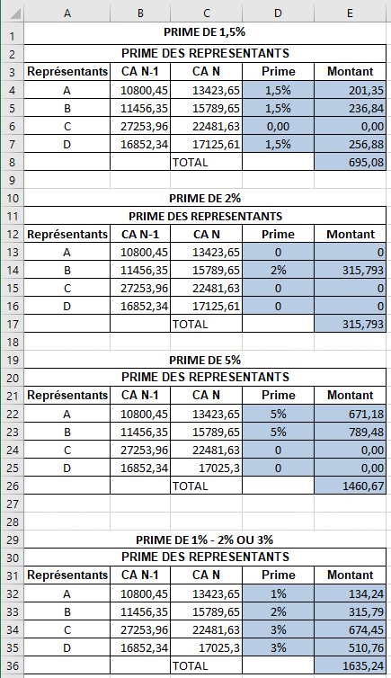 Calculer les différentes primes des représentants, en fonction des consignes suivantes :
