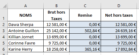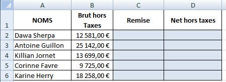 Le montant de la remise doit apparaître dans les cellules C2 à C6, si le client a droit à cette remise. Le reste du tableau est une soustraction.