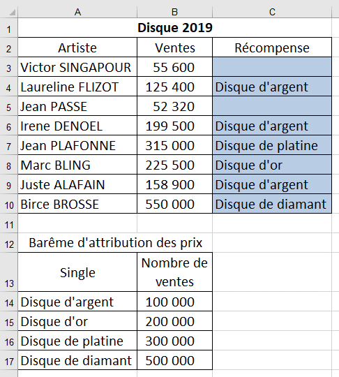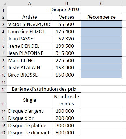 Faire apparaitre la récompense de chaque artiste dans la colonne C grâce à la fonction SI. Dans ce cas précis, il vous fera 3 fonctions imbriquées.