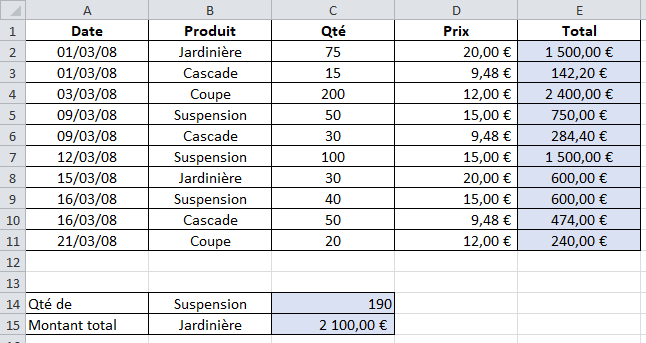 En C15, vous calculez le montant des ventes de JARDINIÈRE sur la période.