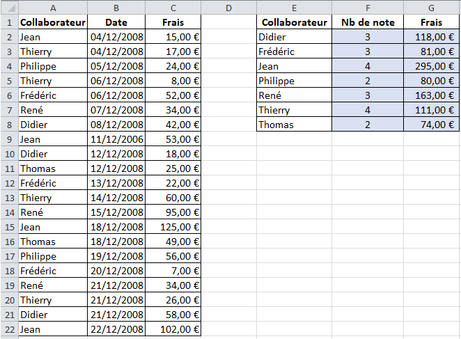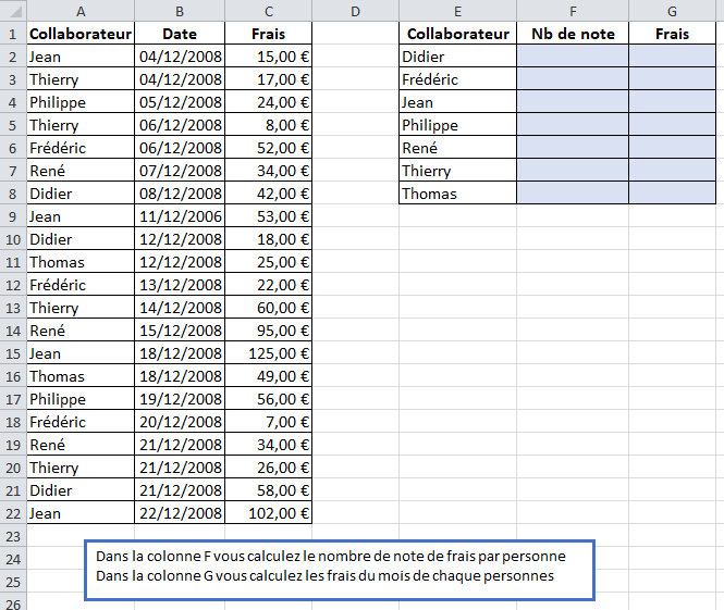 Dans la colonne F, vous calculez le nombre de notes de frais par personneDans la colonne G, vous calculez les frais du mois de chaque personne