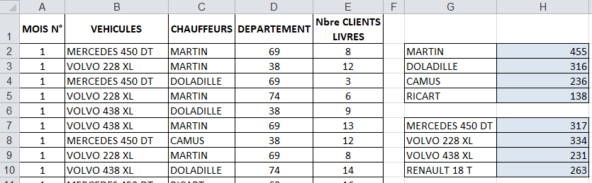Vous créez un tableau récapitulatif pour déterminer le nombre de véhicules livrés, par modèles et par chauffeurs.