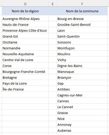 Dans la colonne F, vous faites sortir la liste des communes sans doublons (216).