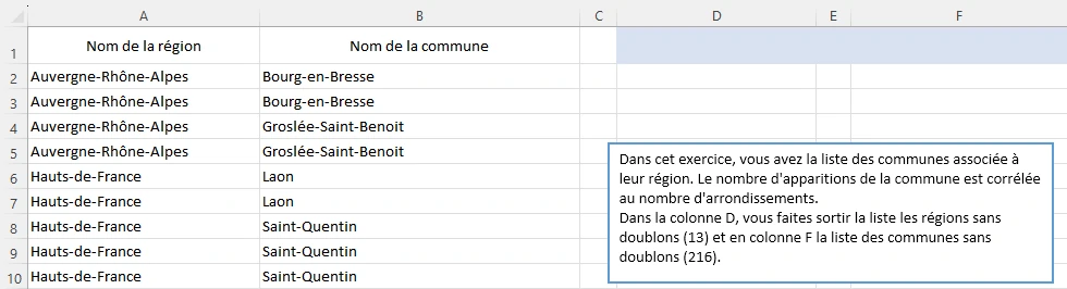 Dans la colonne D, vous faites sortir la liste les régions sans doublons (13).