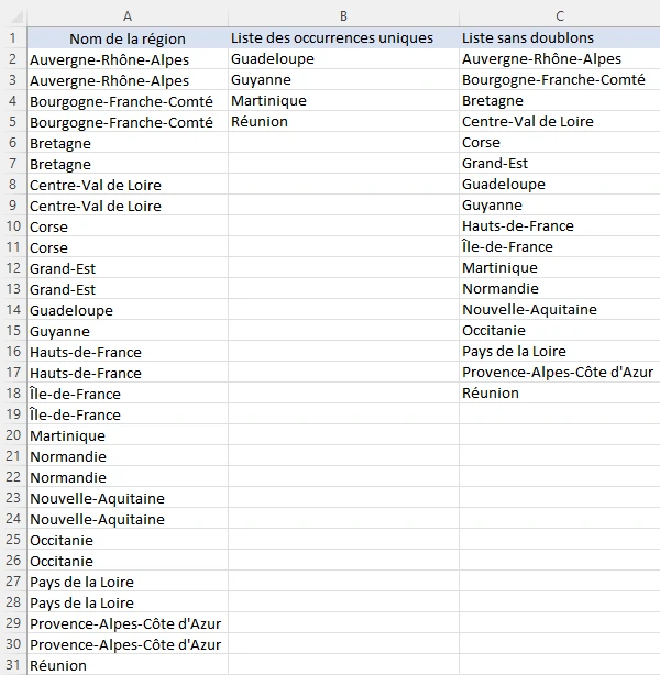 Dans la colonne C la liste des régions sans doublons.