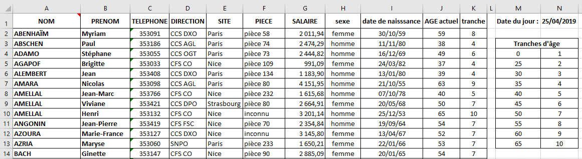 Ce fichier (fictif) représente une entreprise de 284 personnes réparties sur 4 sites. l'âge des salariés se modifie de jour en jour grâce à la fonction =aujourdhui() sur laquelle sont basés les calculs. Chaque tranche d'âges correspond à 5 années.