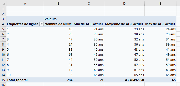 - Pour chaque tranche d'âge : trouver le nombre de personnes, l'âge minimum, la moyenne des âges, l'âge maximum.