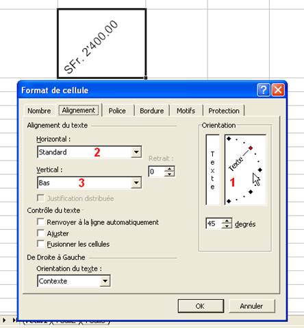 Vous pouvez choisir l’alignement du texte dans la cellule. Le texte peut être aligné de différentes façons horizontalement (2) et verticalement (3), le texte peut également être orienté par degrés (1).