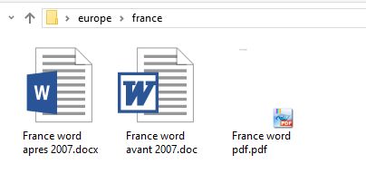 Comme dans l'exemple ci-dessous sous créez un dossier "Europe" sur le bureau, puis un sous dossier "france" à l'intérieur. Dans le dossier France vous enregistrez un document word au trois formats présentés