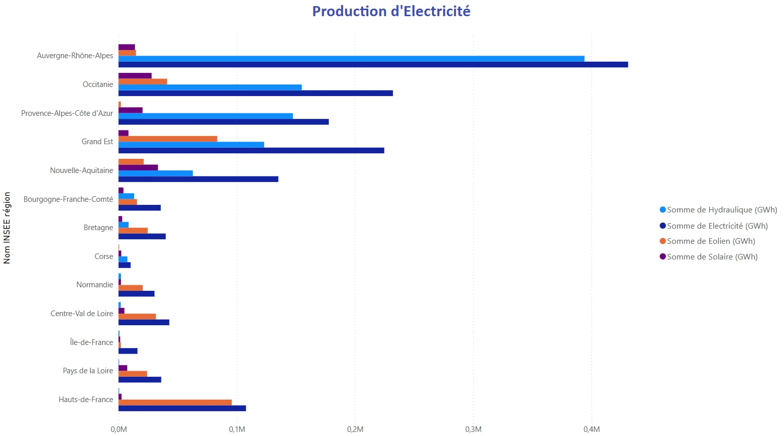Le fichier Excel téléchargeable ci-contre donne la production électrique par année, région et type de production. Après import, vous faites une représentation graphique à barres groupées.