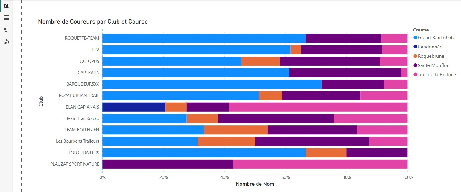 Après l'import du fichier Excel dans Power BI, vous utilisez la visualisation Graphique à barres empilées 100% pour comparer la répartition des coureurs par club en fonction des courses