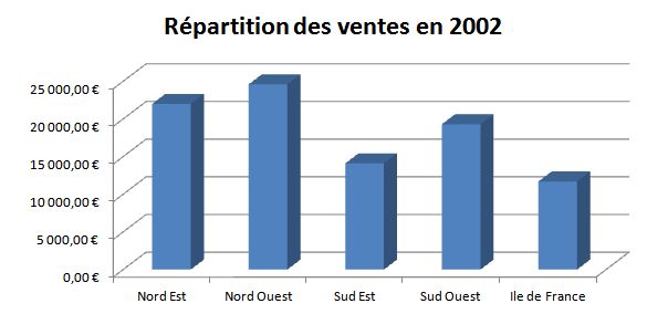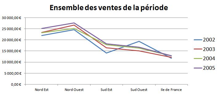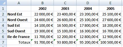 Consignes : La société Aleou réalise des ventes sur toutes la France. Créer plusieurs représentations graphiques des ventes, des années 2002 à 2005 en fonction des consignes. Téléchargez le fichier de travail ci-contre ou recopier le tableau ci-dessous.