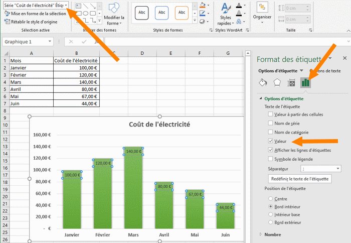 Insérez le titre Coût de l'électricité à l'axe des abscisses et Mois à l'axe des ordonnées.