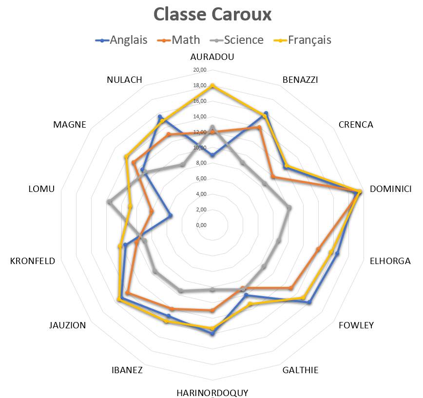 Après avoir téléchargé le fichier de travail, vous proposez l'insertion d'un graphique en "radar" pour illustrer les notes des élèves de cette classe. Vous augmenterez la taille de la police et appliquez un léger relief aux traces.