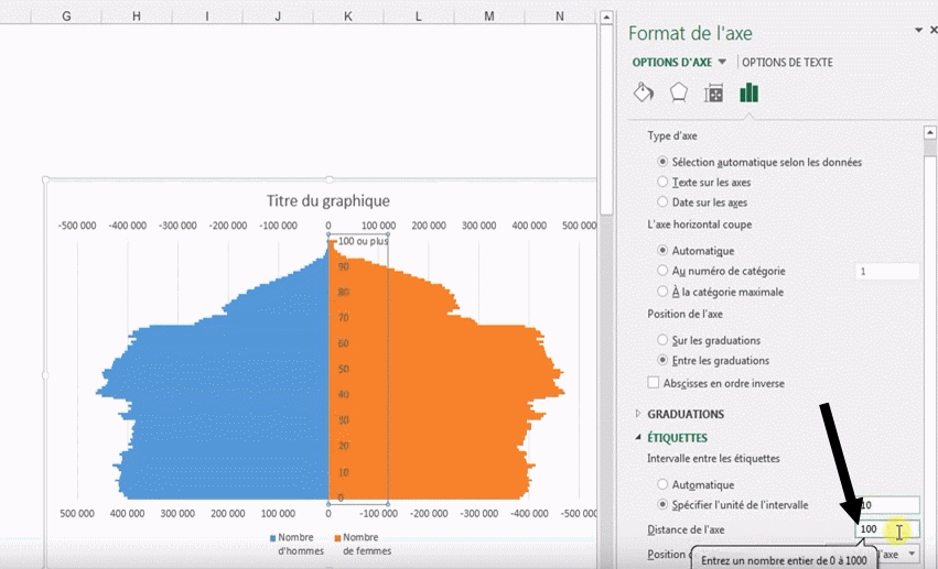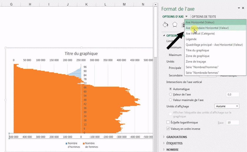 La mise en place d'une pyramide des âges n'est pas prévue dans Excel. Il faut donc personnaliser son graphique