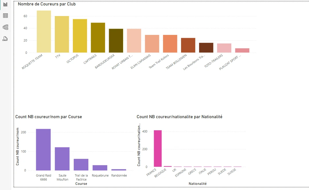 Dans cet exercice, vous utilisez le visuel Histogramme groupé, un grand classique pour mettre en valeur le nombre de coureurs par club. Pour aller plus loin, vous pouvez également, par exemple, afficher le nombre de coureurs par course et par nationalité.