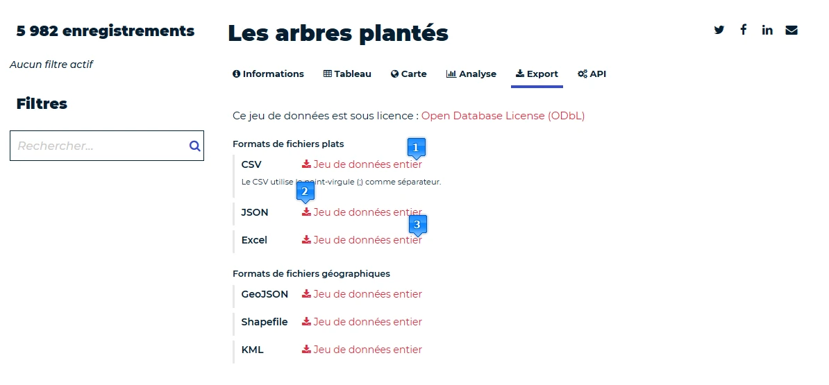 Vous téléchargez les trois jeux de données CSV, JSON, XLSX