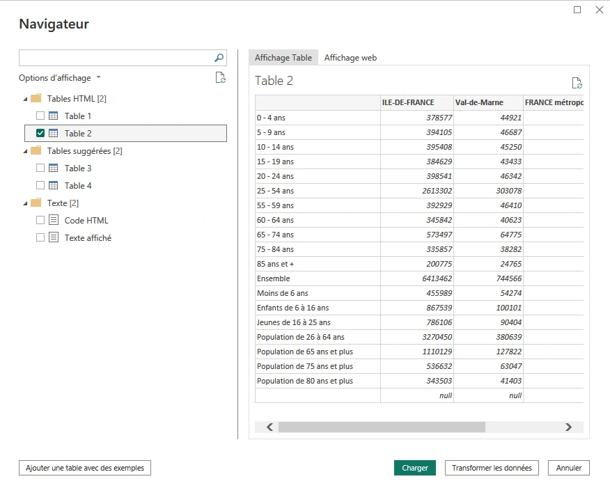 Après travail d'importation, Power BI vous propose tous les tableaux qu'il trouve sur la page web indiquée.