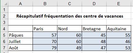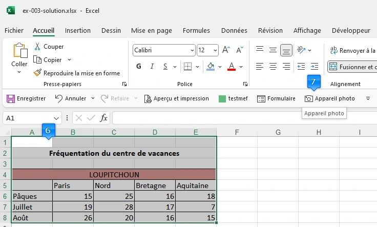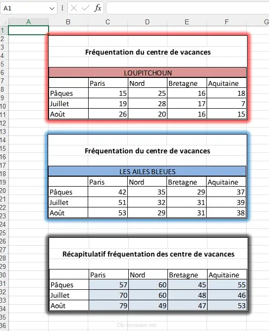 Sur cette feuille, vous devez faire un récapitulatif dynamique de la fréquentation des deux centres de vacances des feuilles : "pitchoun" et "ailesbleues" et dans un second temps utiliser l'appareil photo d'Excel pour créer une capture écran dynamique des trois tableaux.