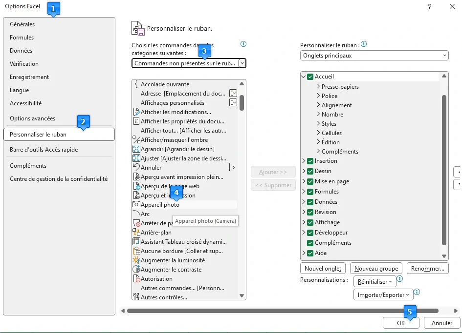 Dans un premier temps faire apparaitre le bouton appareil photo d'Excel, qui n'est pas apparent par défaut.