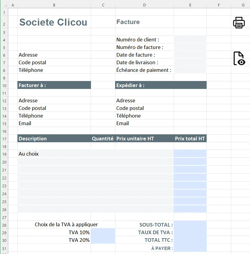L'objectif de l'exercice est de créer un modèle de facture, d'insérer un bouton d'impression direct et un bouton d'aperçu avant impression via 2 macros.