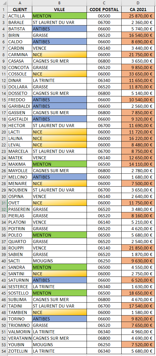 - Les cellules de la colonne D supérieures à 6000 euros sont en orange