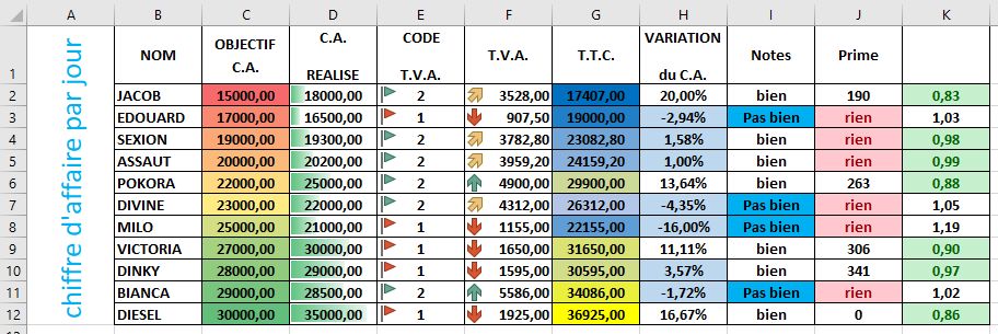 Mise en forme conditionnelle complète par colonne et en fonction de 9 séries de critères.