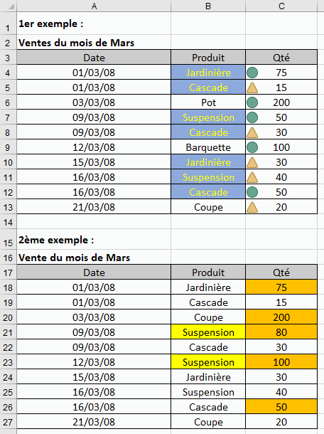 Dans cette zone, ce qui est supérieur ou égal à 50 doit être repéré par un rond vert, le reste par un triangle orange. Les icônes sont issues des jeux d'icônes Excel ou libre Office