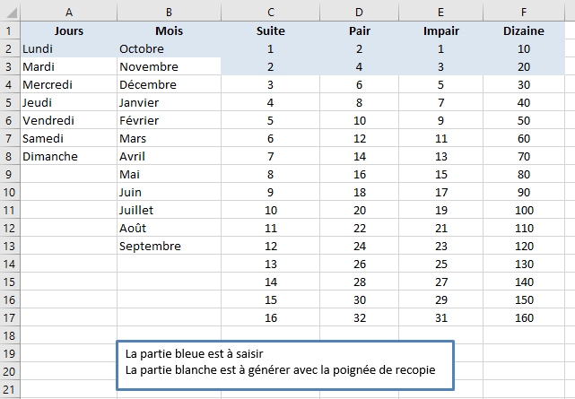 Après avoir ouvert un classeur Excel, reproduire le tableau ci-dessous (uniquement la partie bleue) et utiliser la poignée de recopie pour la suite.
