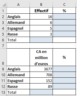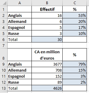 Vous calculez le pourcentage des effectifs et du CA pour les 4 nationalités présente dans le tableau