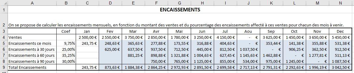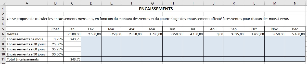 On se propose de calculer les encaissements mensuels, en fonction du montant des ventes et du pourcentage des encaissements affecté à ces ventes pour chacun des mois à venir.