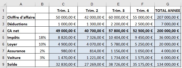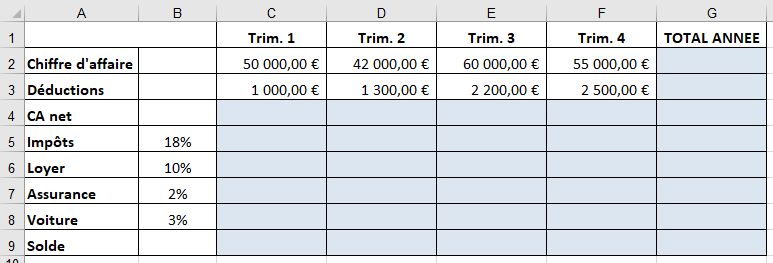 Les cellules C5-F8 se calculent sur la ligne 4 avec une utilisation obligatoire de la référence absolue