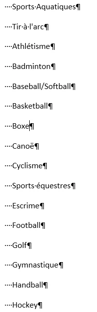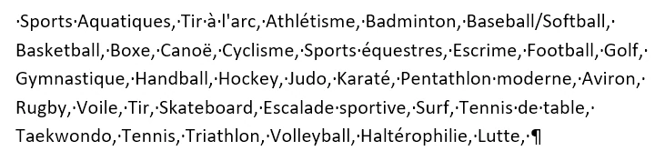 supprimer les 4 espaces devant chaque sport et le saut de paragraphe afin d'obtenir une liste de sport séparé par des virgules. (bouton Spécial dans la fenêtre (chercher/remplacer))