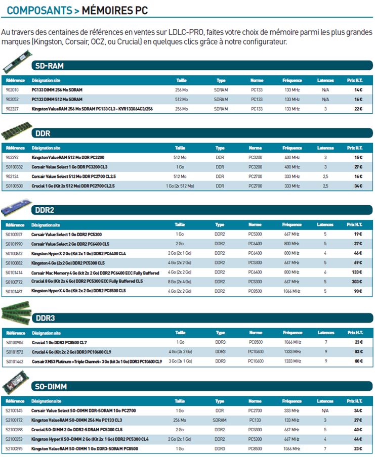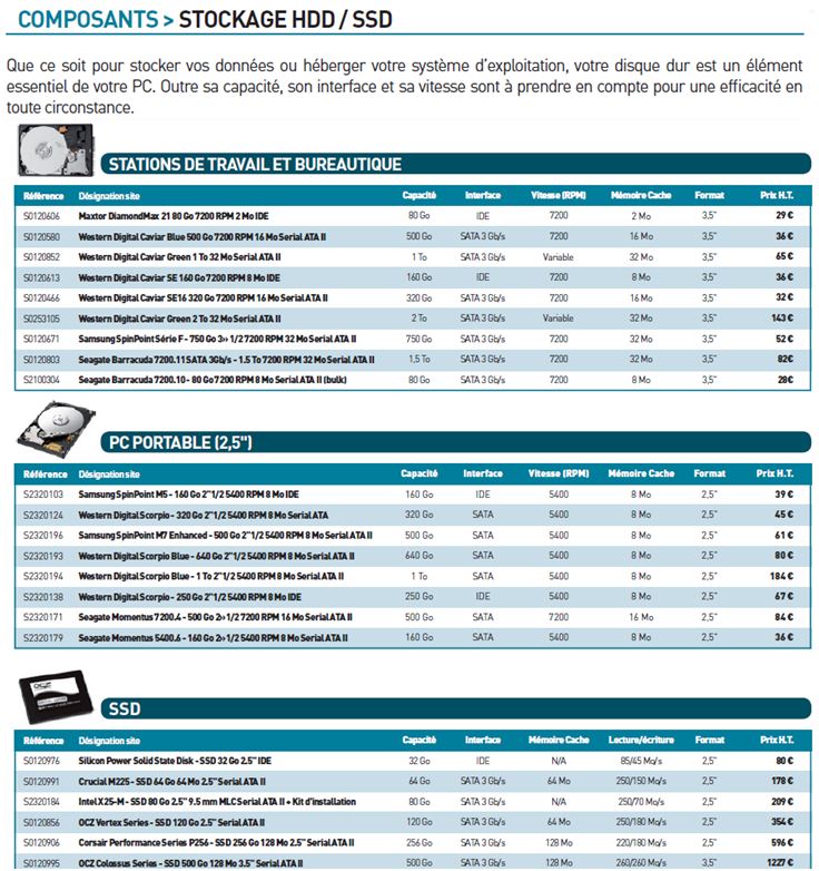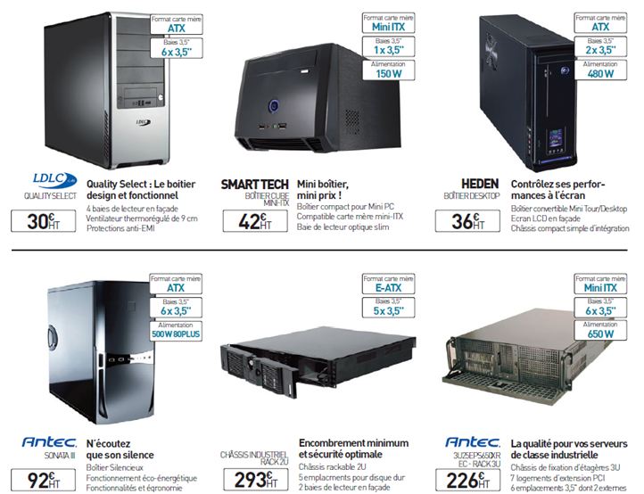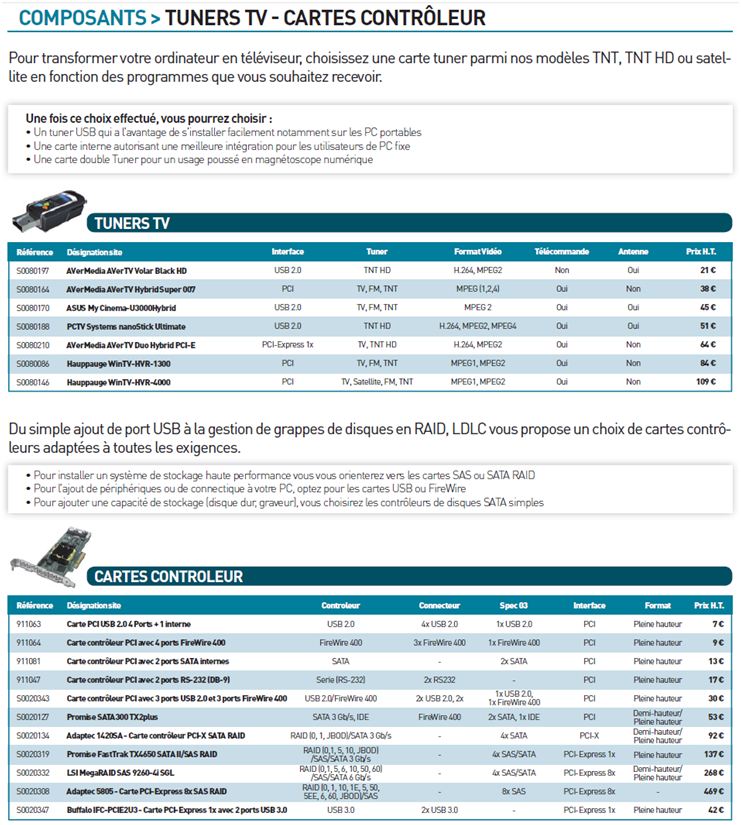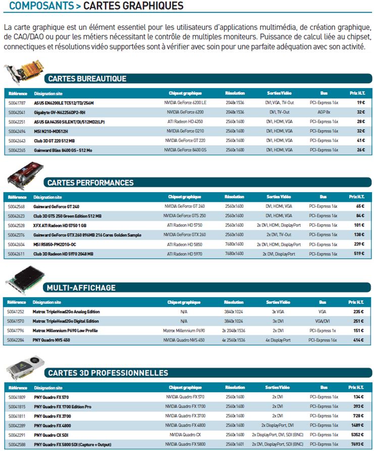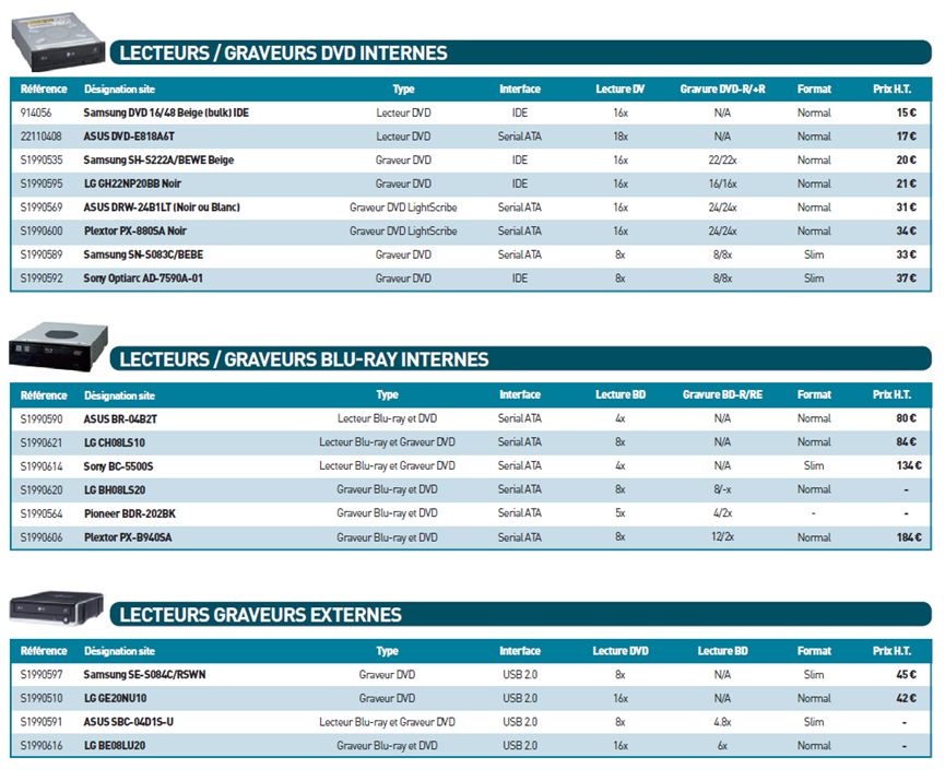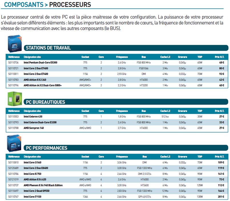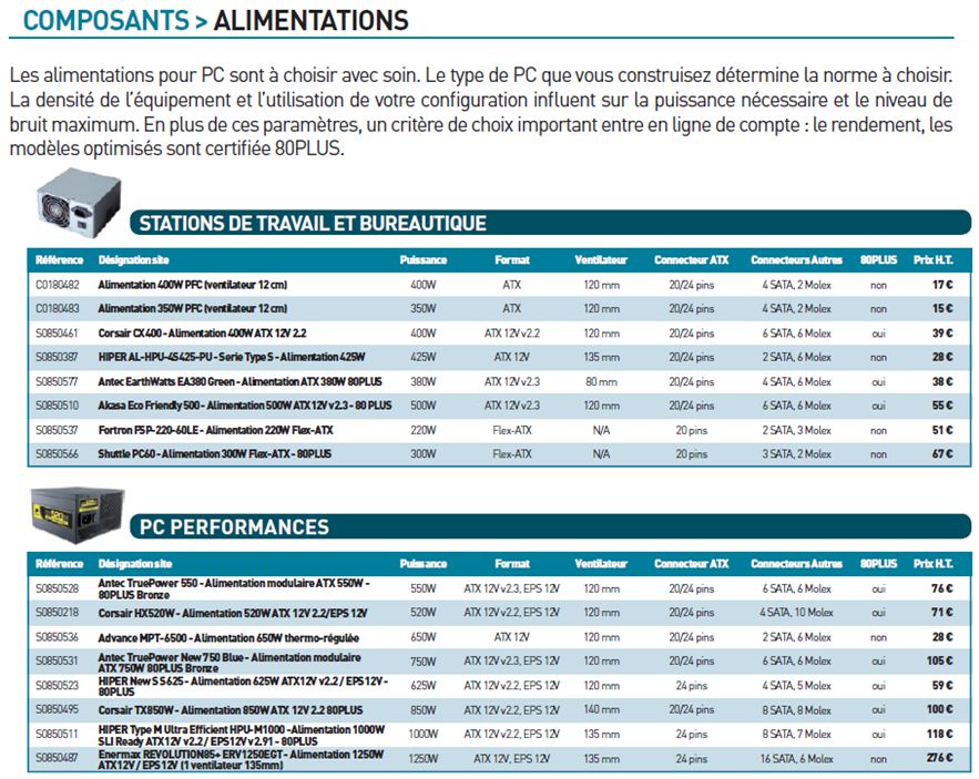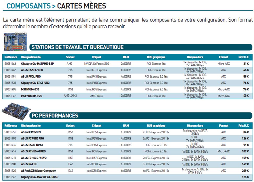 D’après le catalogue vous construisez un tableau Excel qui reprend vos propositions pour chaque service (sur la même feuille de calcul Excel) avec la désignation du composant, le prix HT et le prix TTC que vous calculerez (20%).