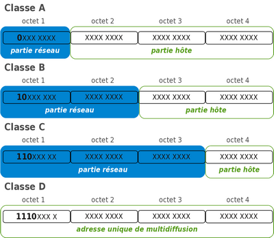 Le premier octet a une valeur comprise entre 192 et 223 ; soit 3 bits de poids fort égaux à110. Les 3 premiers octets désignent le numéro de réseau et le dernier correspond à l'adresse de l'hôte. - Classe D