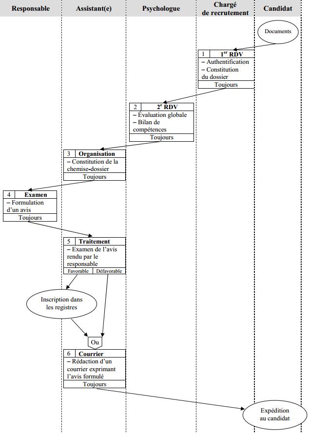 | Chargé de recrutement | 1 | 1ᵉʳ RDV – fourniture du CV, des diplômes, des certificats de travail – vérification – constitution du dossier du candidat | Candidat |