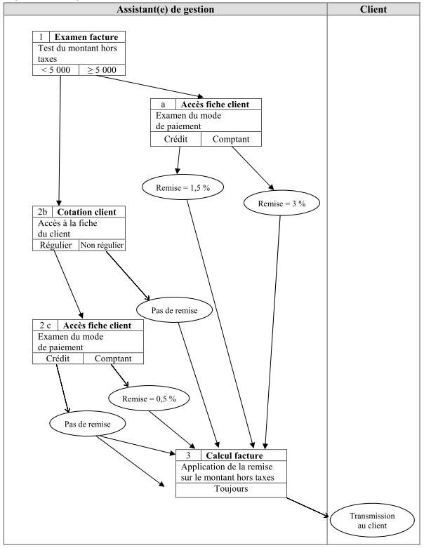 Au moment de facturer deux cas se présentent : 1ᵉʳ cas la facture est inférieur à 5000€, si c'est un client occasionnel pas de remise. Si c'est un client régulier et qu'il paye comptant, il a droit à une remise de 1,5%, sinon pas de remise.