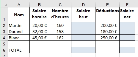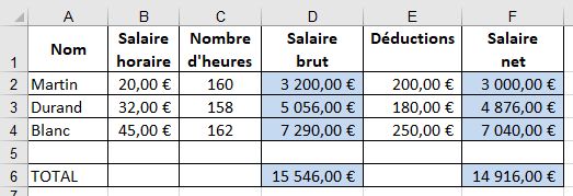 - Calculez le salaire net ainsi que le total des salaires brut et net,