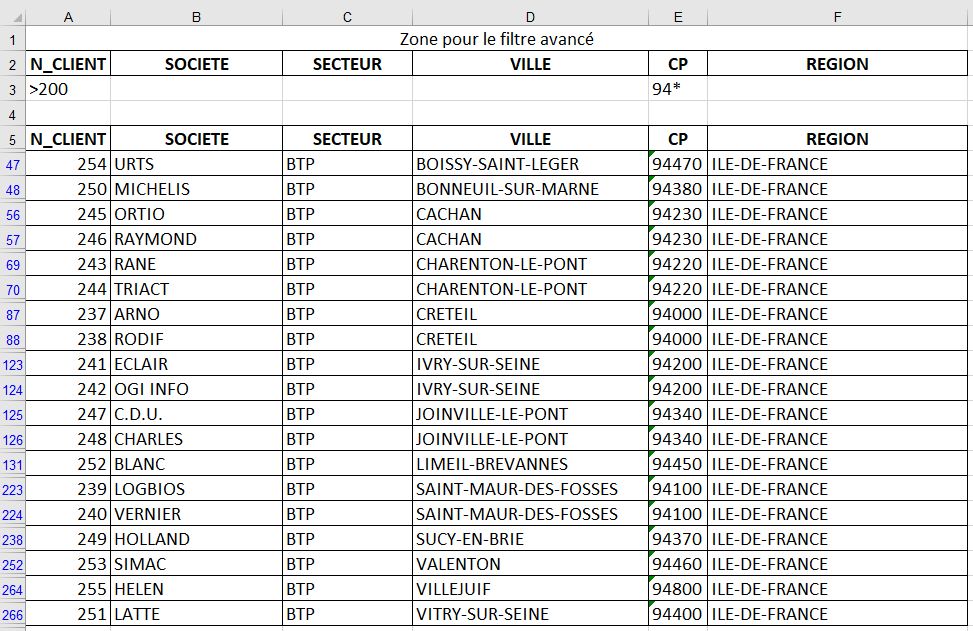 Filtrez sur place Les sociétés dont le code client est supérieur à 200 dans le Val-de-Marne