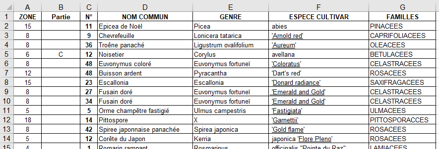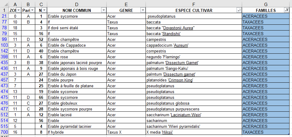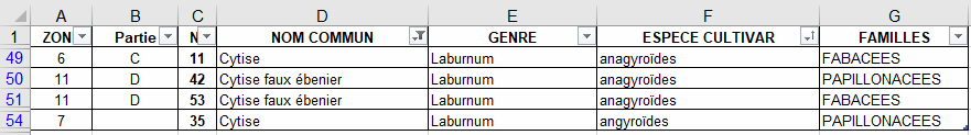 Feuille 1 : Vous filtrez les familles de plantes surlignées bleues