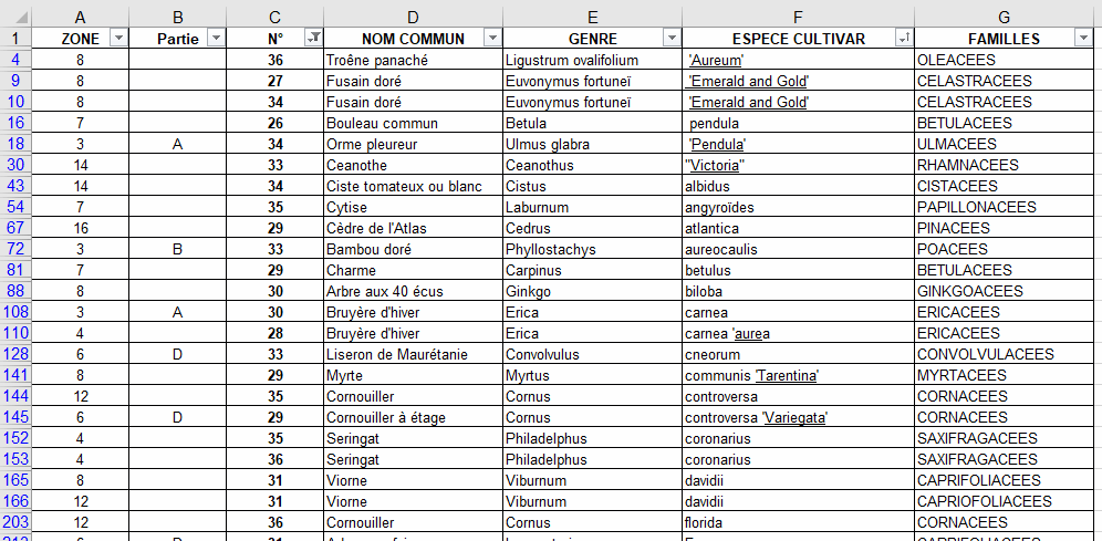 Feuille 3 : Vous filtrez les plantes des numéros de 26 à 36