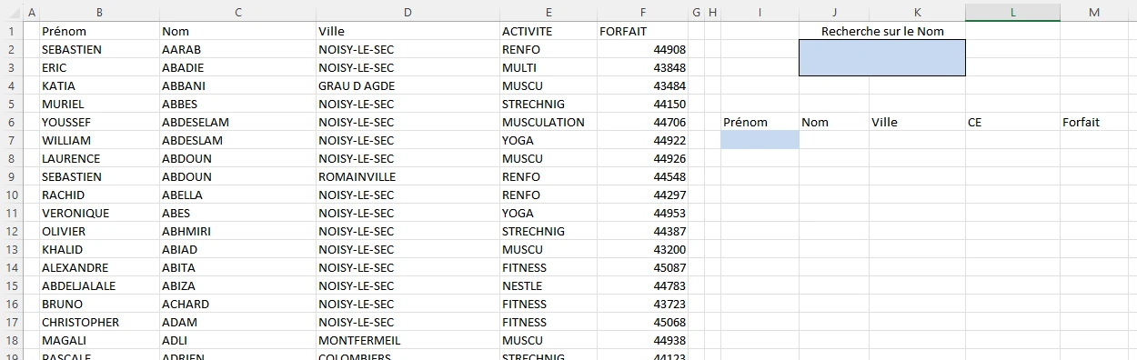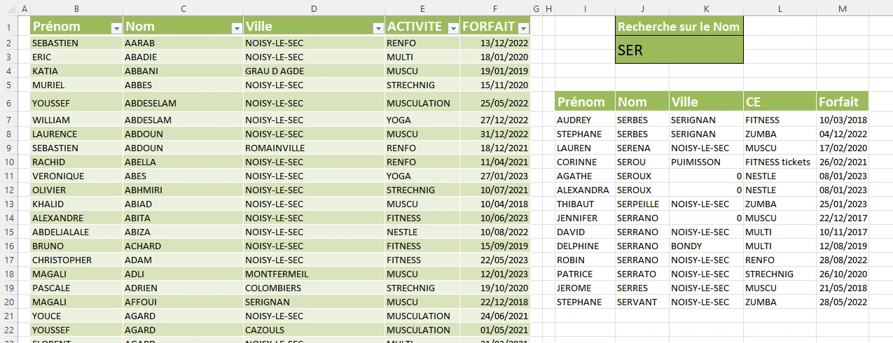 Vous devez réaliser un tableau de recherche avec la fonction FILTRE ? pour trouver rapidement, par le nom de famille, la fiche de chaque inscrit. En saisissant le début du nom et ENTRÉE, la zone de résultat les occurrences rencontrées