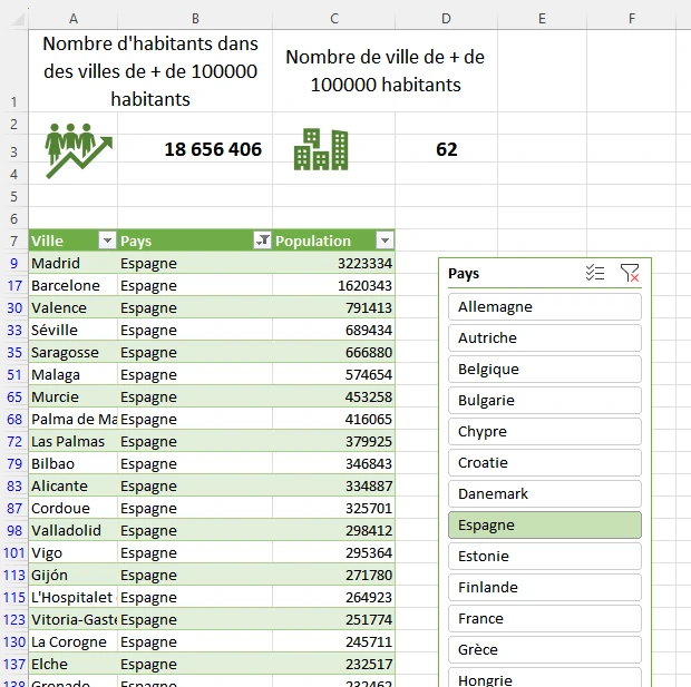 Afin d'améliorer la présentation de la feuille, vous pouvez utiliser la fonction AGREGAT afin de calculer dynamiquement la valeur de la colonne "Pays" et "Population". Par exemple pour la Croatie le résultat sera 3 pour le nombre de villes de plus de 100 000 habitants et 1097843 pour le nombre d'habitants.