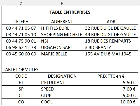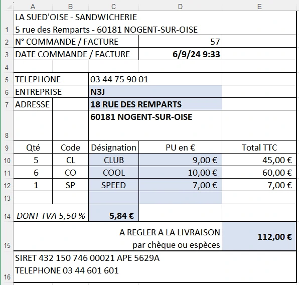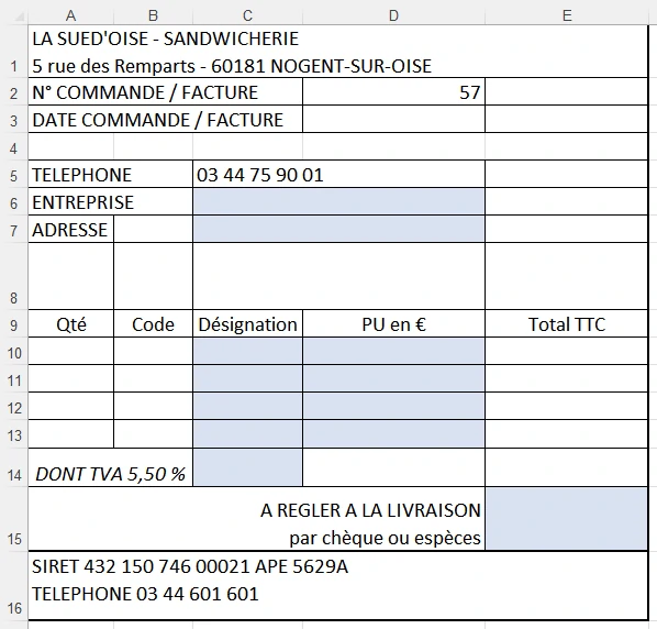 La SUÉD'OISE-SANDWICHERIE livre aux entreprises de Nogent-sur-Oise des formules repas (sandwich + dessert + boisson). Elle souhaite automatiser la facturation des commandes.