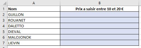 Vous limitez la saisie des cellules à une valeur comprise entre 10 et 20.En cas d'erreur le message suivant apparait :"Entre 10€ et 20€ c'est pas compliqué quand même !!"