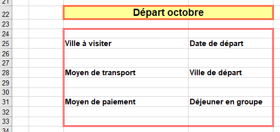 - Les 6 rubriques du cadre rouge doivent être créées avec des listes déroulantes